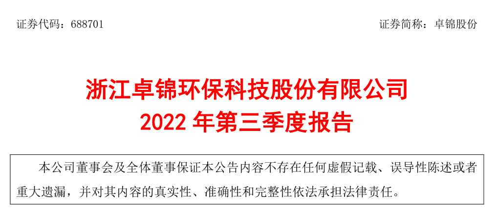 浙江卓錦環(huán)保科技股份有限公司2022年三季度報(bào)告