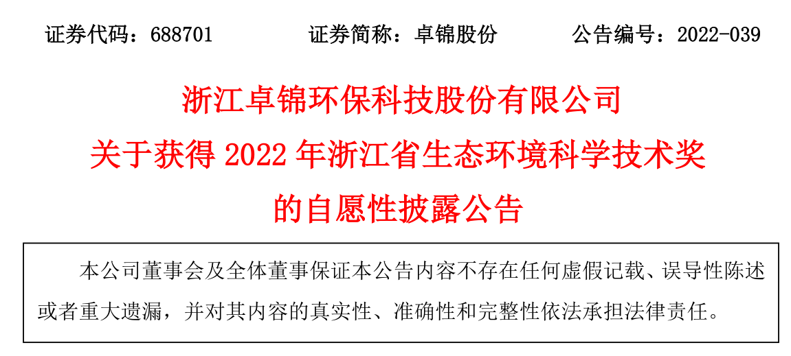 關于獲得2022年浙江省生態環境科學技術獎的自愿性披露公告