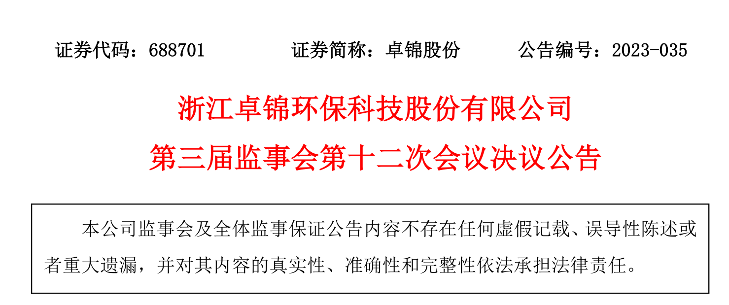 浙江卓錦環保科技股份有限公司第三屆監事會第十二次會議決議公告