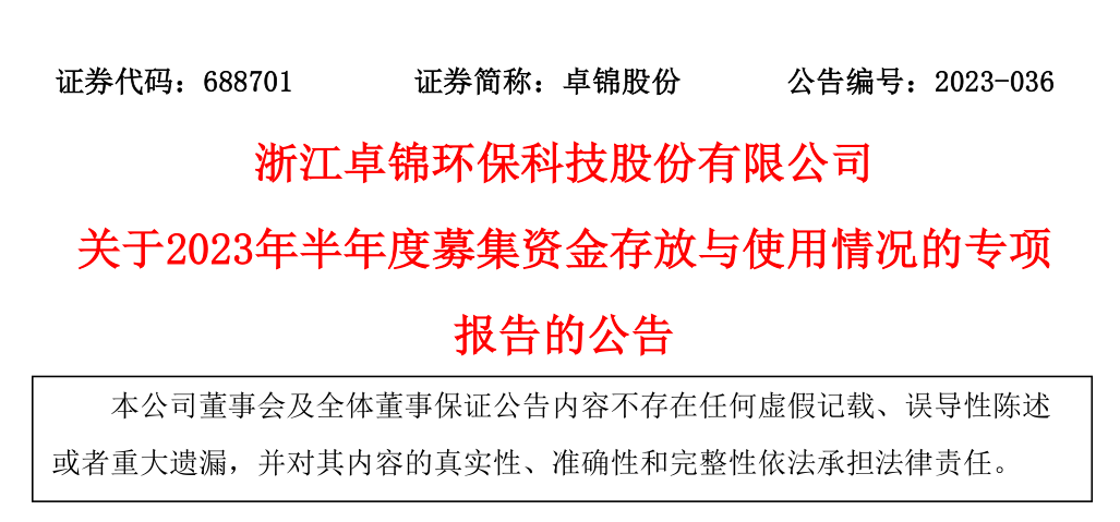 浙江卓錦環保科技股份有限公司關于2023年半年度募集資金存放與使用情況的專項報告的公告