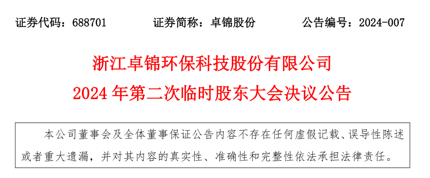 浙江卓錦環(huán)保科技股份有限公司2024年第二次臨時股東大會決議公告