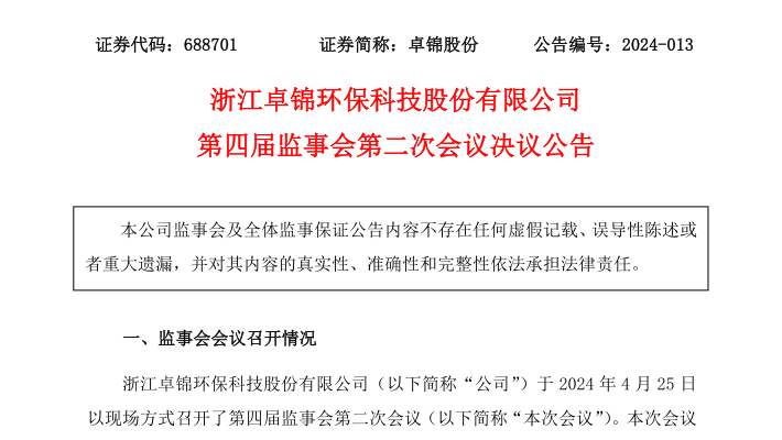 浙江卓錦環保科技股份有限公司第四屆監事會第二次會議決議公告
