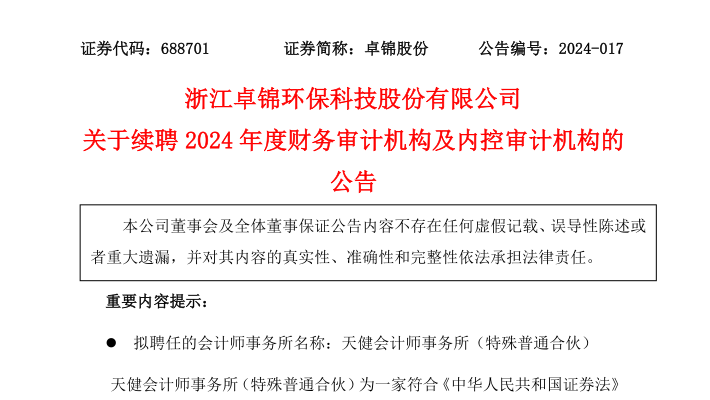 浙江卓錦環保科技股份有限公司關于續聘2024年度財務審計機構及內控審計機構的公告