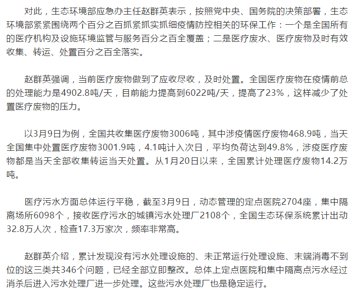 生態環境部:1月20日以來累計處理醫廢14.2萬噸,污水處理末端消毒不到位等問題已全部整改