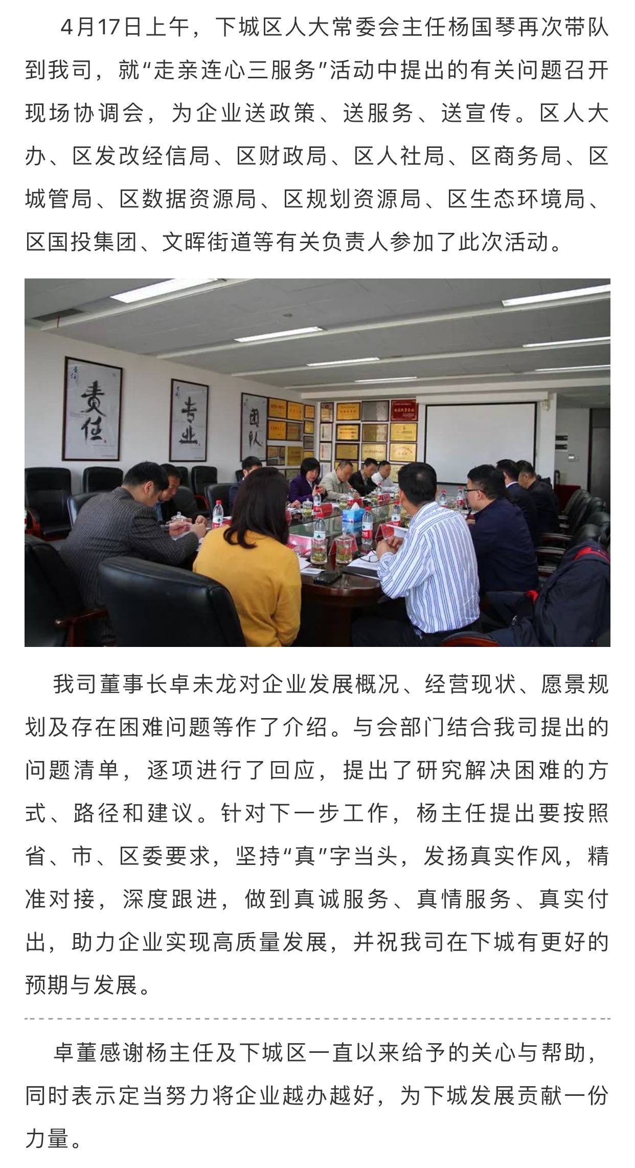 下城區人大常委會主任楊國琴一行前來卓錦環保開展“走親連心三服務”活動